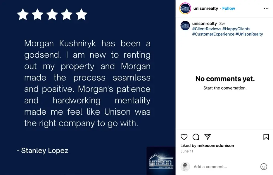 Unison is a seasoned property management and real estate company offering a diverse portfolio of services — from furnished and unfurnished rentals to executive condos and single-family homes. Known for their commitment to customer satisfaction, Unison prides itself on quick response times, professionalism, and exceptional service quality.